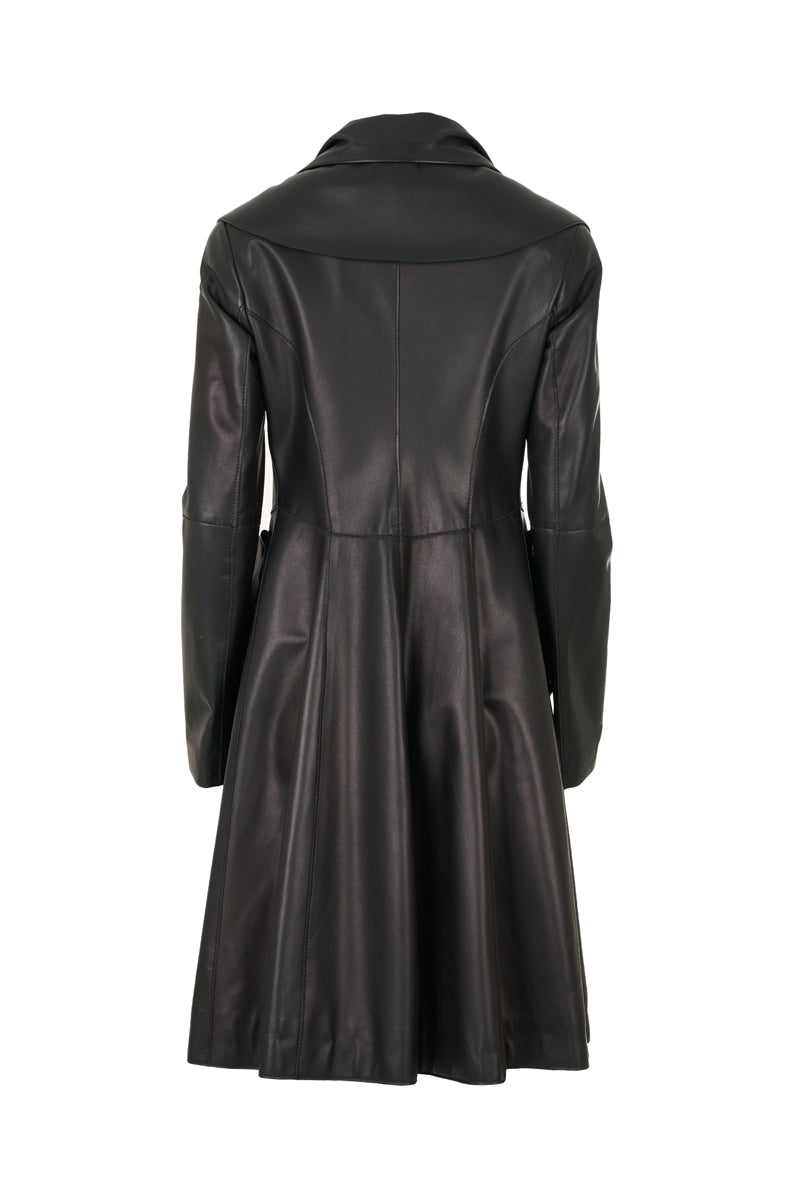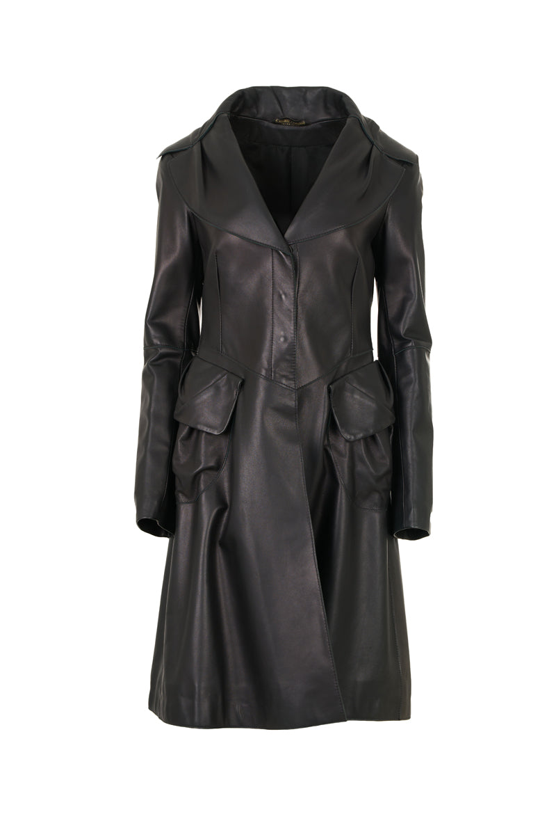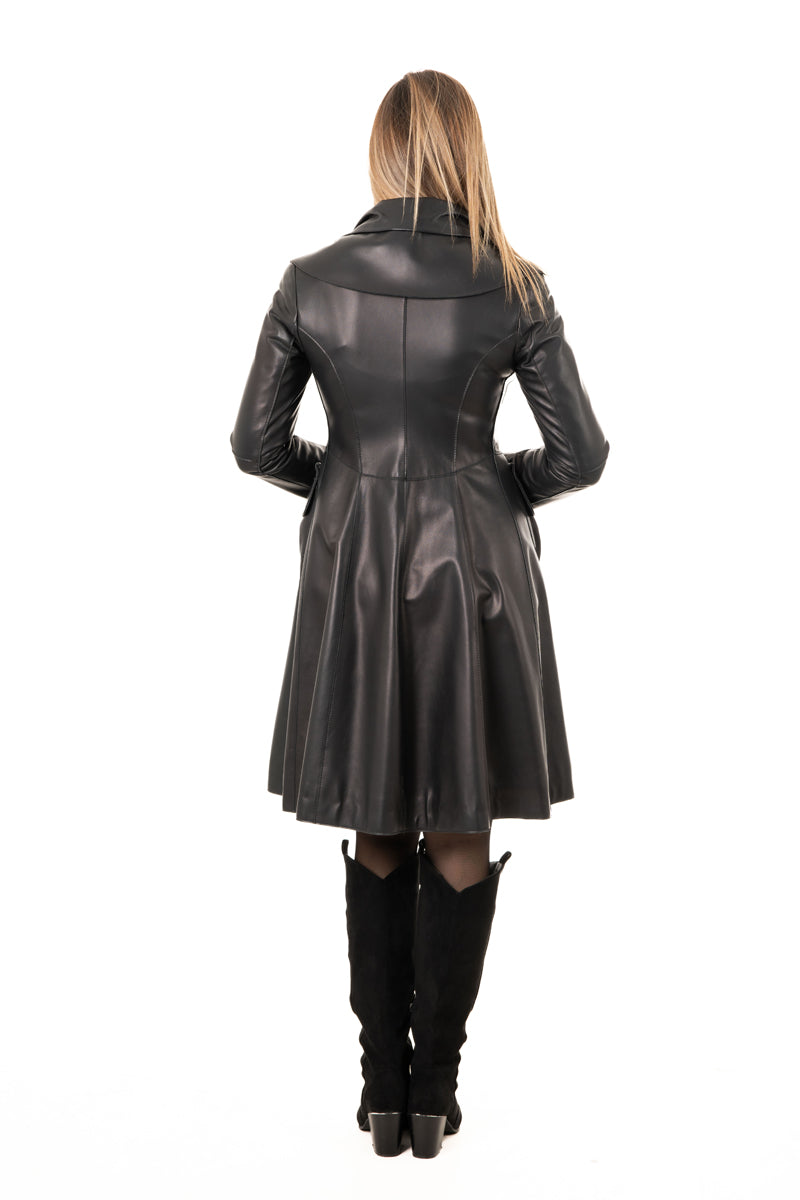 Κομψή δερμάτινη καμπαρντίνα σε αμπίρ γραμμή, που τονίζει τη μέση και πέφτει ανάλαφρα χαρίζοντας θηλυκότητα.