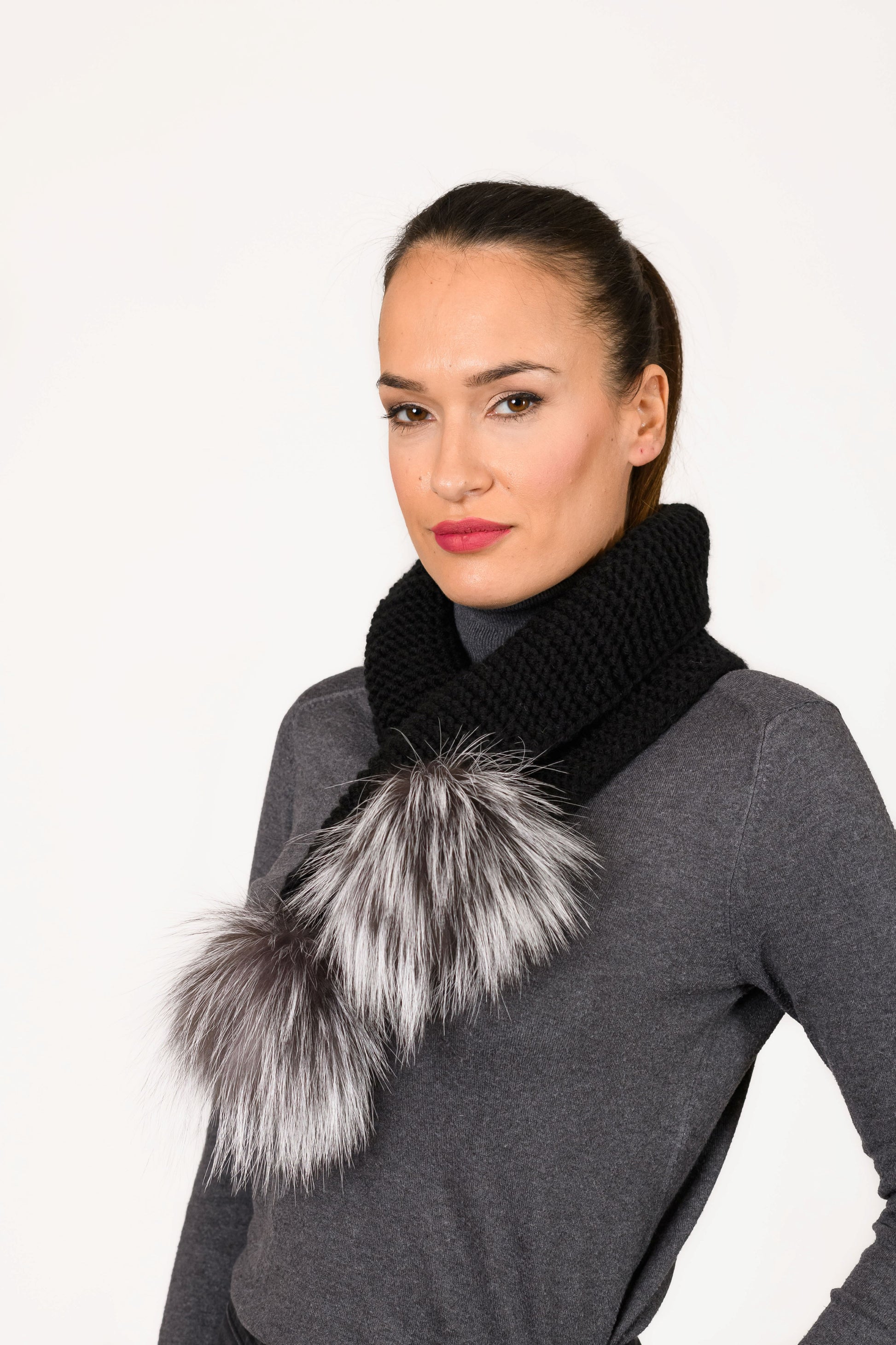 Χειροποίητο πλεκτό κασκόλ με φουντίτσες από silver fox— ένα κομψό και πρακτικό αξεσουάρ που φοριέται εύκολα.