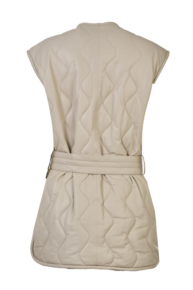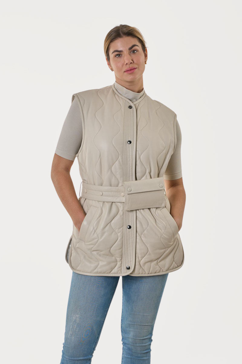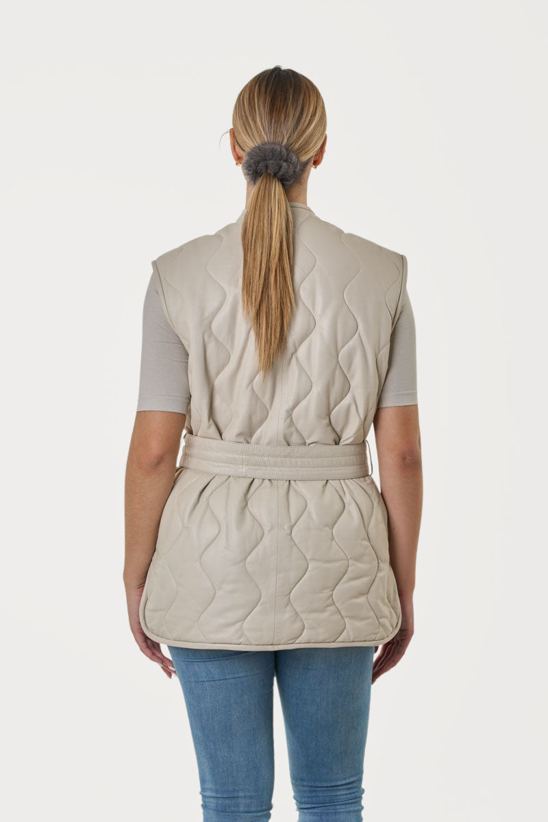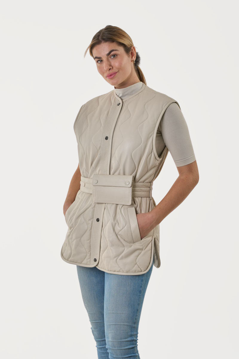 Γυναικείο εκρού δερμάτινο γιλέκο, χειροποίητο από απαλό και ανθεκτικό δέρμα αρνιού κατεργασίας νάπα, με αποσπώμενο δερμάτινο τσαντάκι που περνάει μέσα από τη δερμάτινη ζώνη.