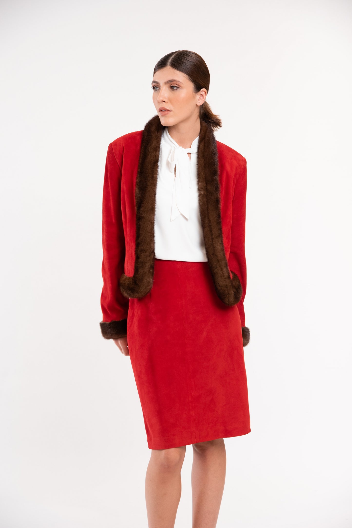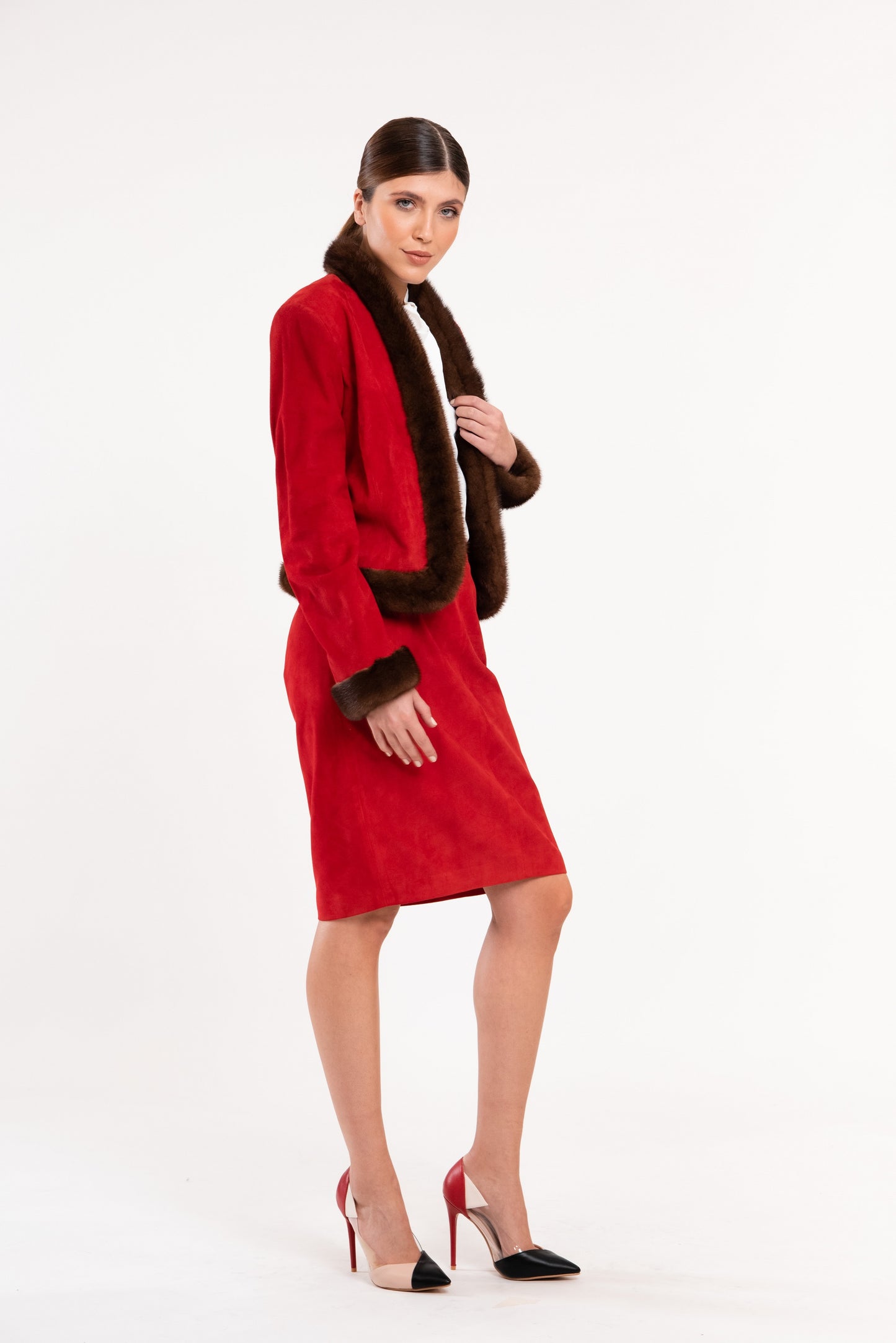 Ένα χειροποίητο σύνολο από υψηλής ποιότητας κόκκινο σουέτ και γούνα μινκ, σχεδιασμένο να αναδεικνύει τη σιλουέτα με μια vintage αισθητική.