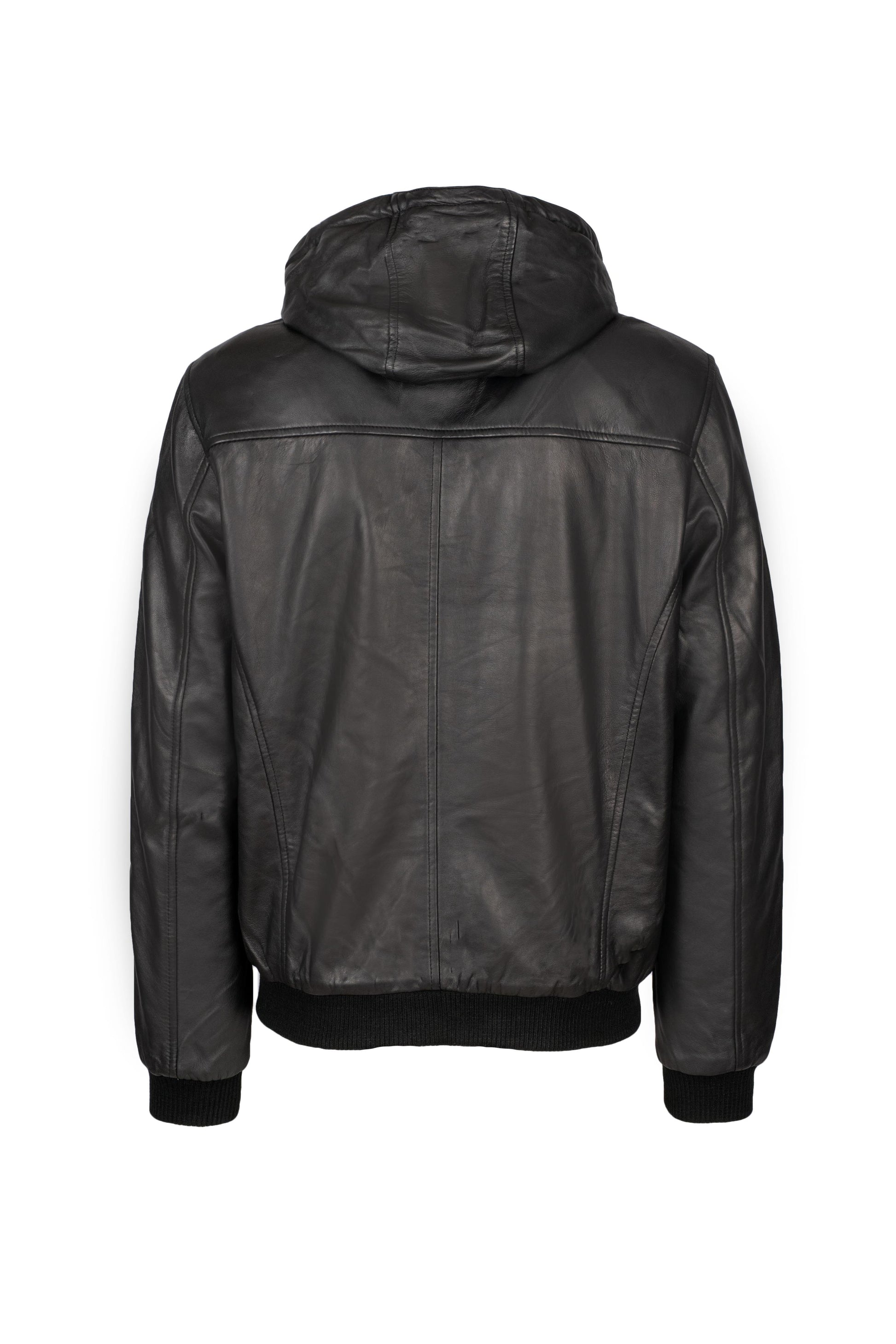 Άνετο μαύρο δερμάτινο bomber μπουφάν με αποσπώμενη κουκούλα και λεπτομέρειες από πλεκτό λάστιχο