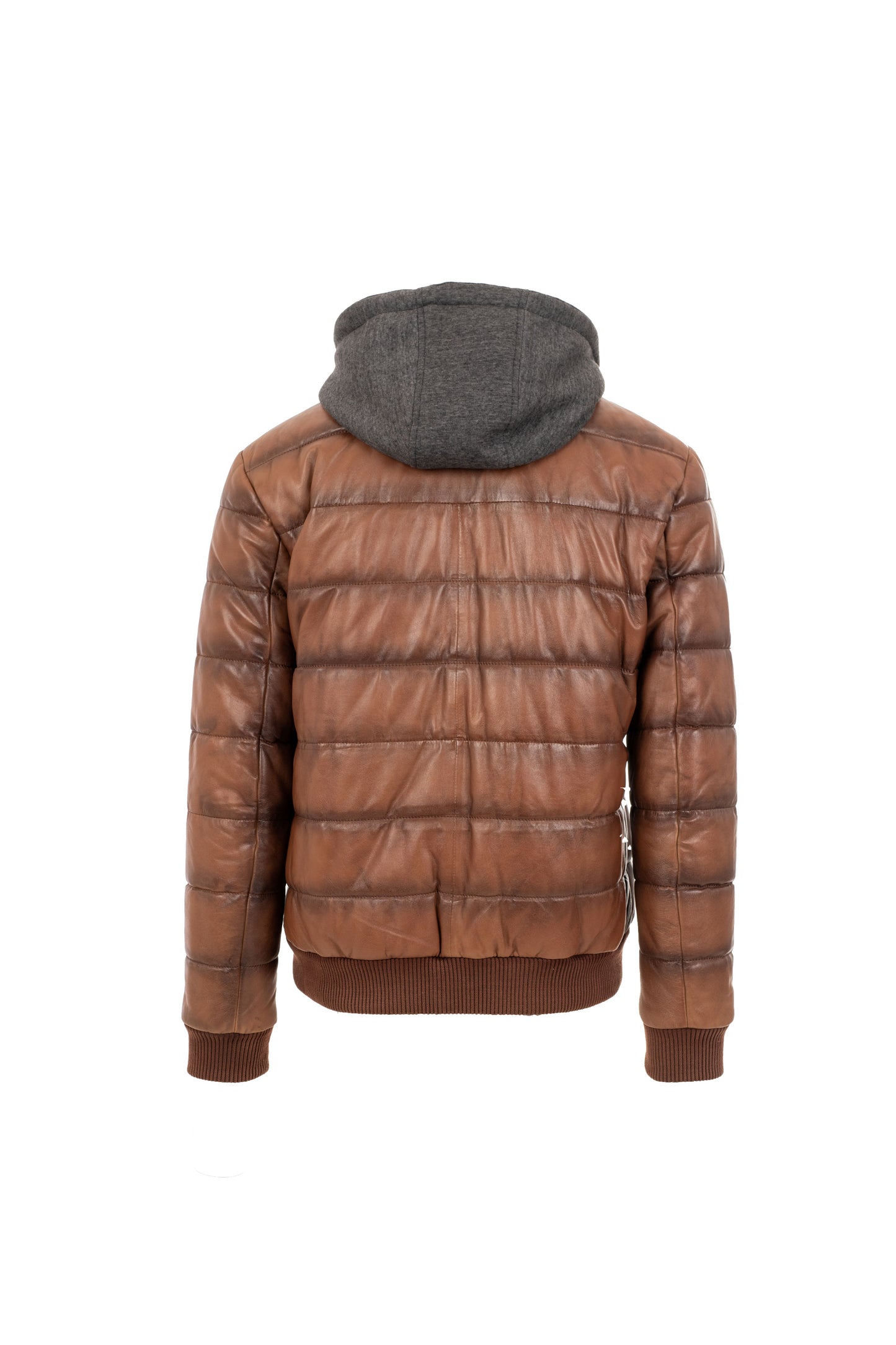 Αντικέ καφέ δερμάτινο μπουφάν με αποσπώμενη κουκούλα από ύφασμα φλις.