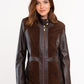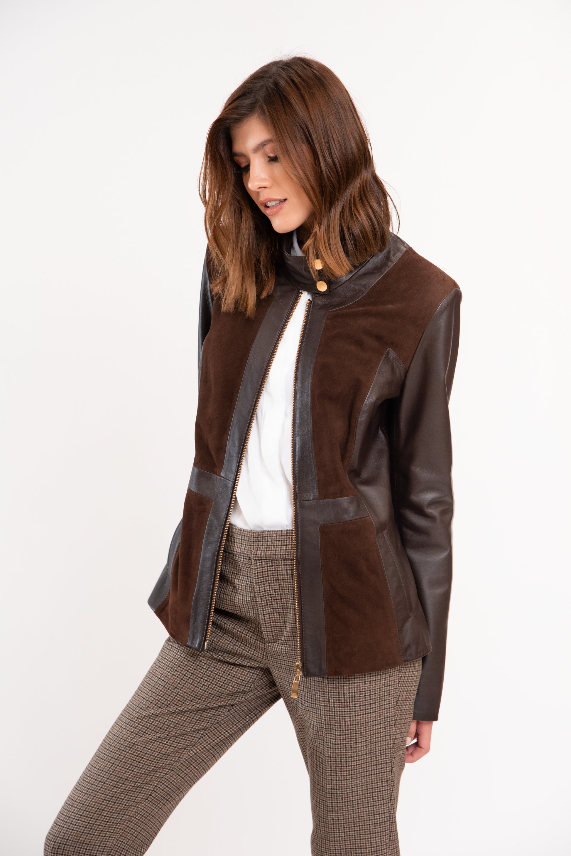 Κομψό χειροποίητο μπουφάν από εκλεπτυσμένο συνδυασμό δέρματος nappa και καφέ σουέτ. Σχεδιασμένο σε κανονική regular γραμμή — απλώς επιλέξτε το συνηθισμένο σας μέγεθος.