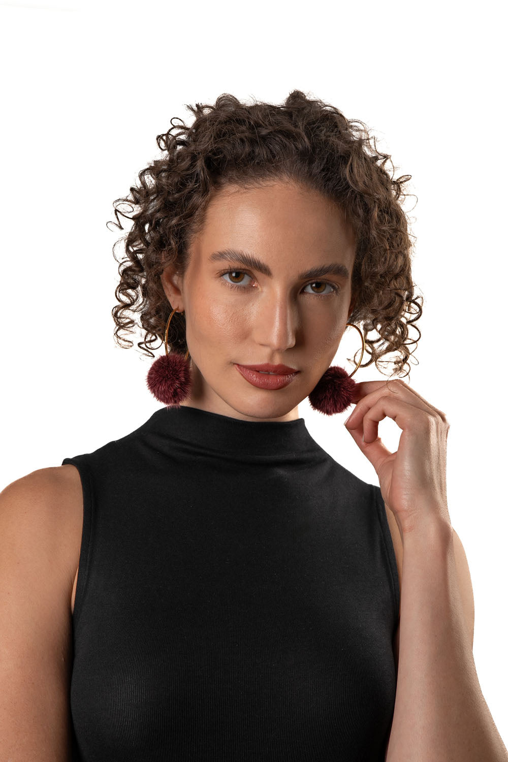 Σκουλαρίκια με βιζόν πομπομ σε δαμασκηνί χρώμα.