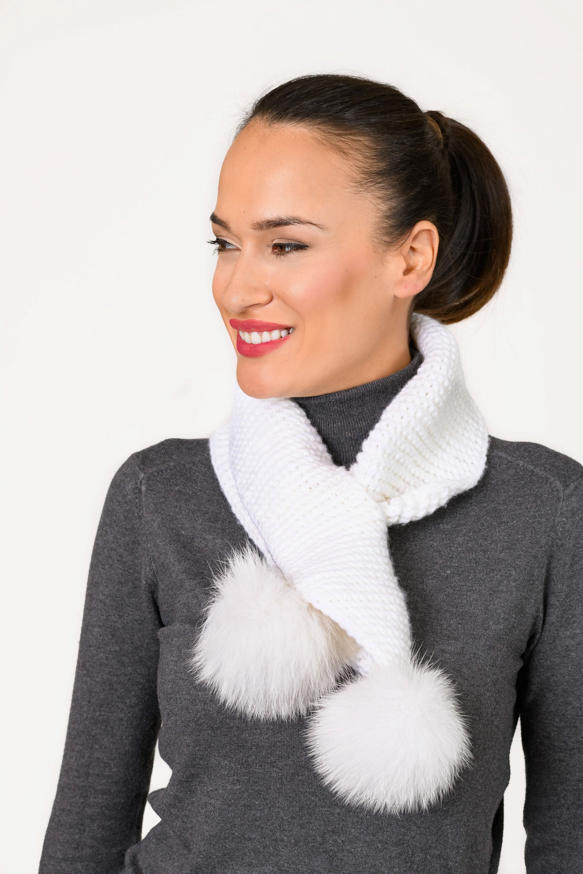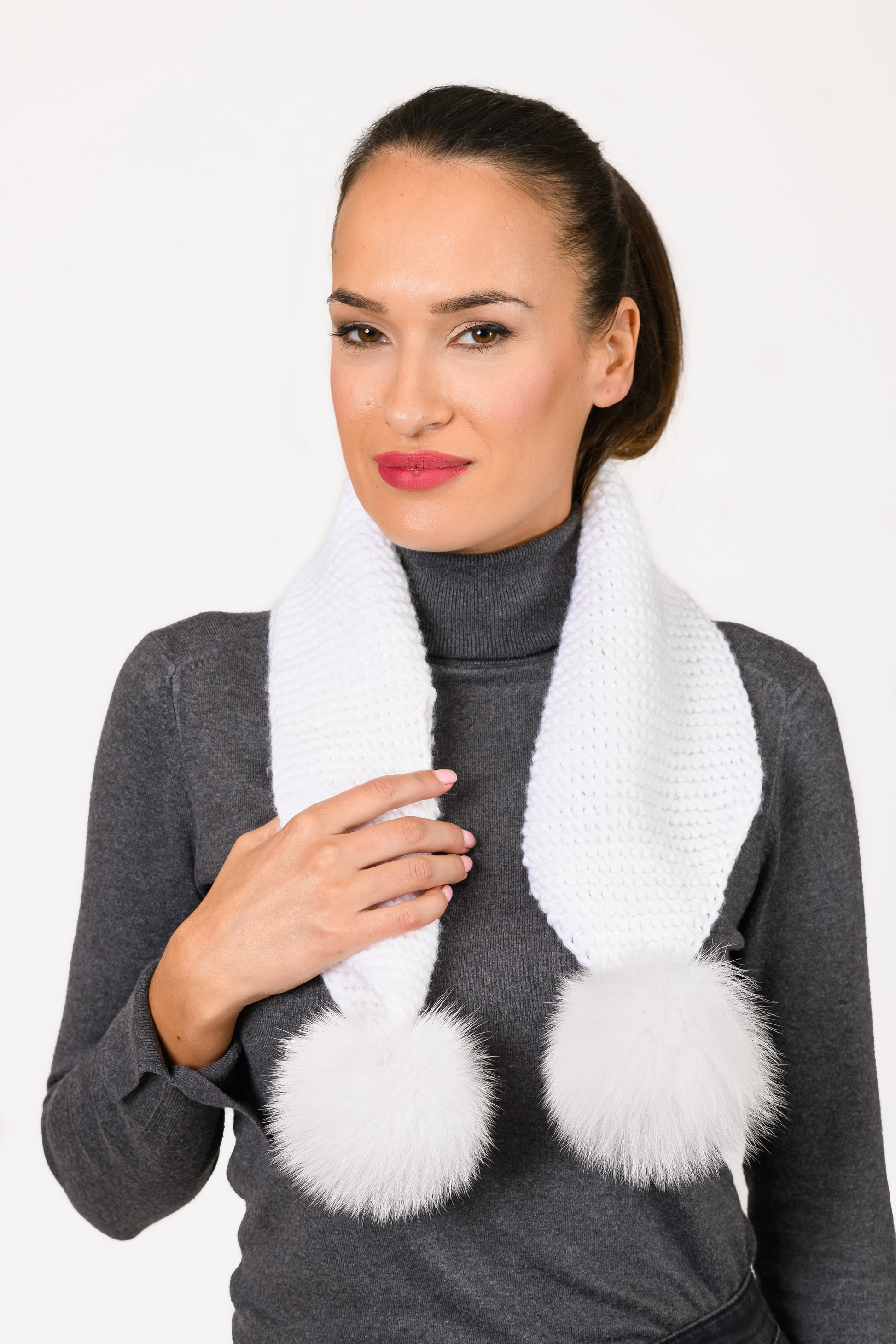 Χειροποίητο ΛΕΥΚΟ Πλεκτό Κασκόλ Με Γούνινα Πομ Πομ.