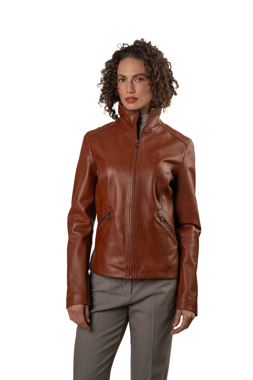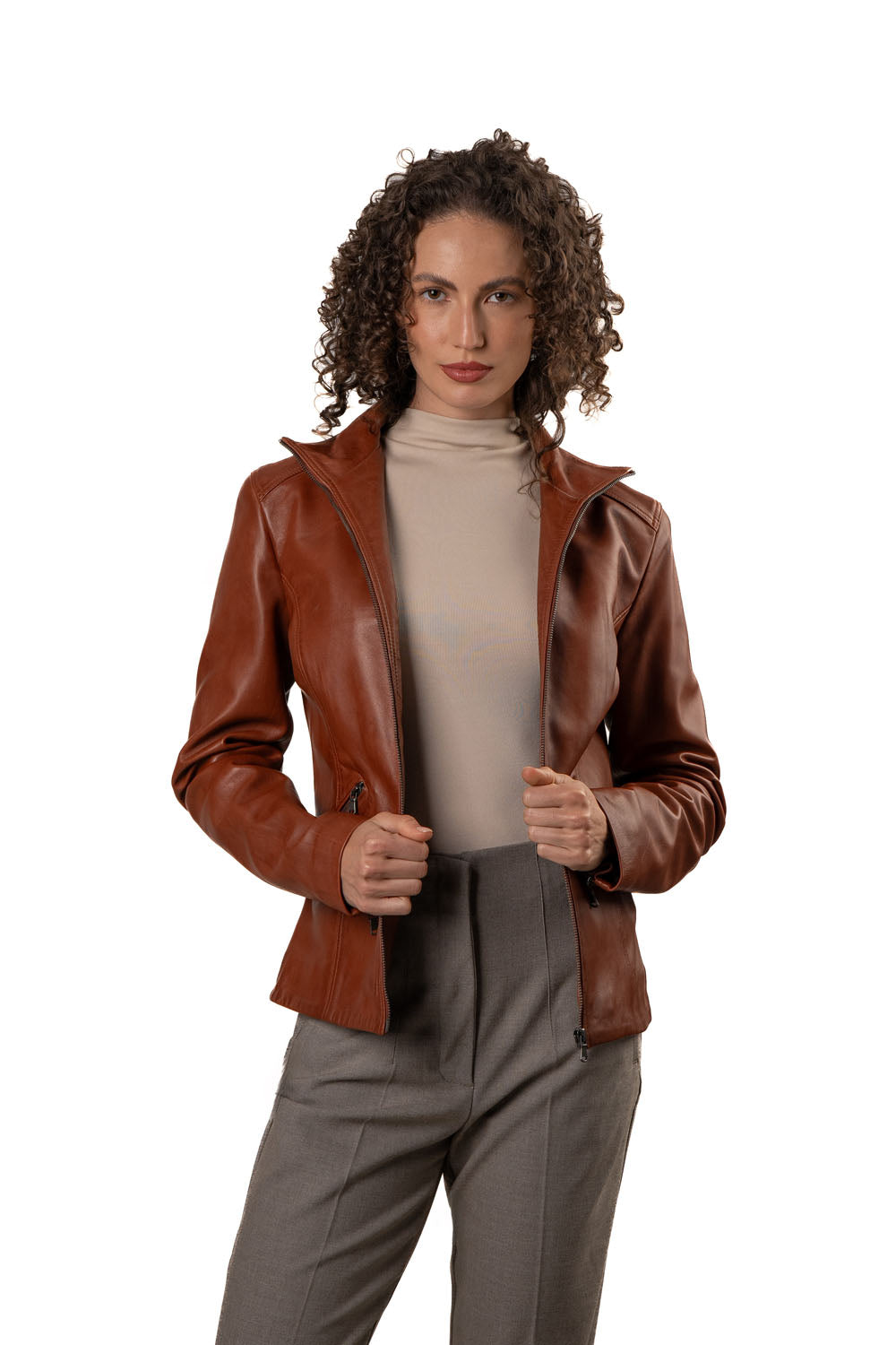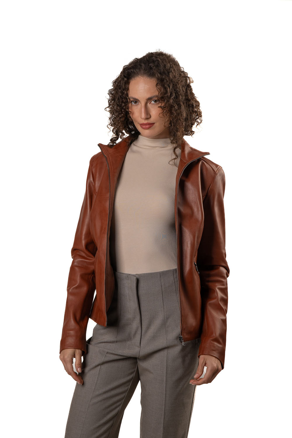 Γυναικείο δερμάτινο μπουφάν σε χρώμα Ταμπά-κονιάκ,