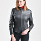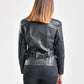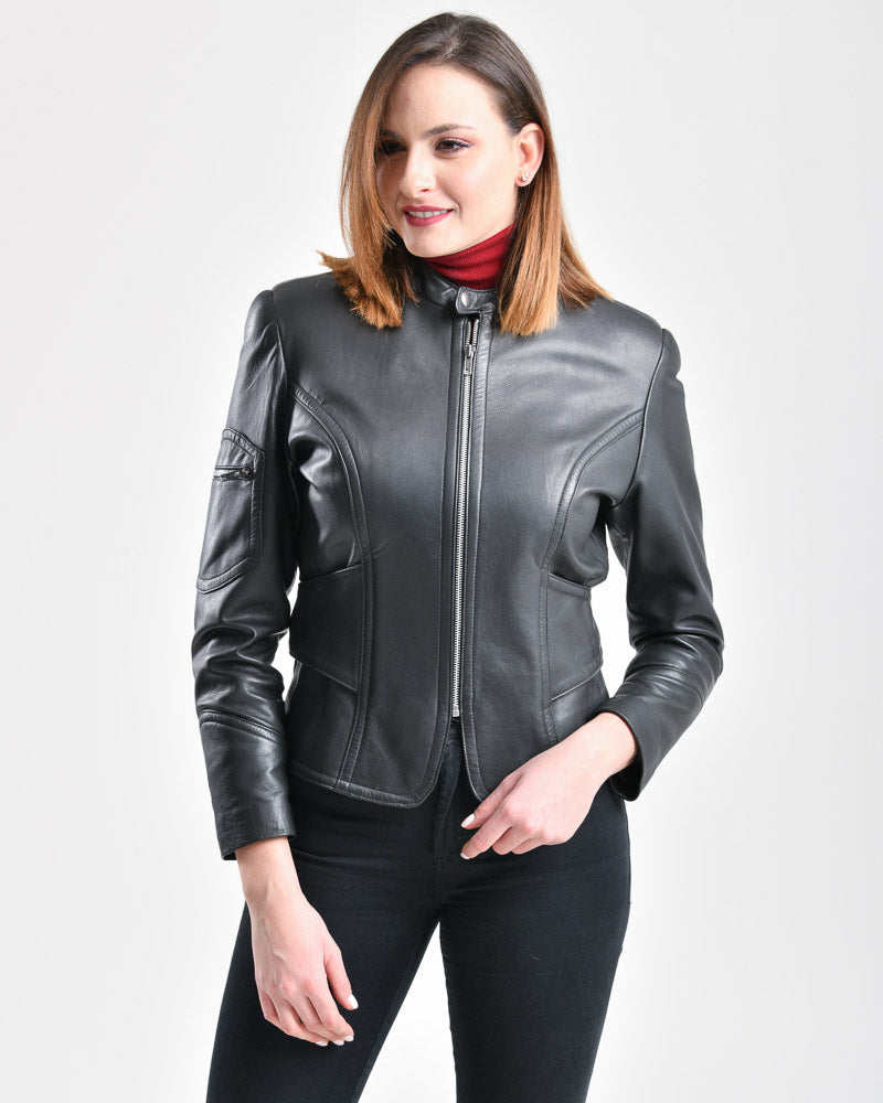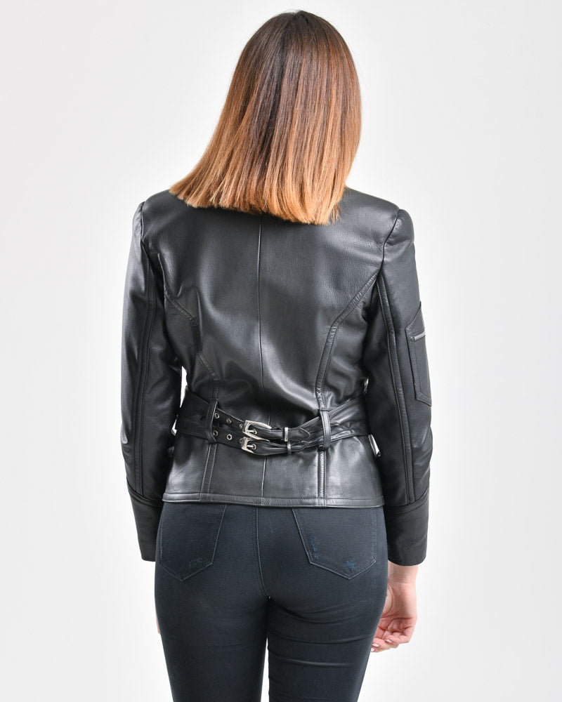 Black leather jacket wirh mandarin collar, leather belt in the back and zipper closure in the center