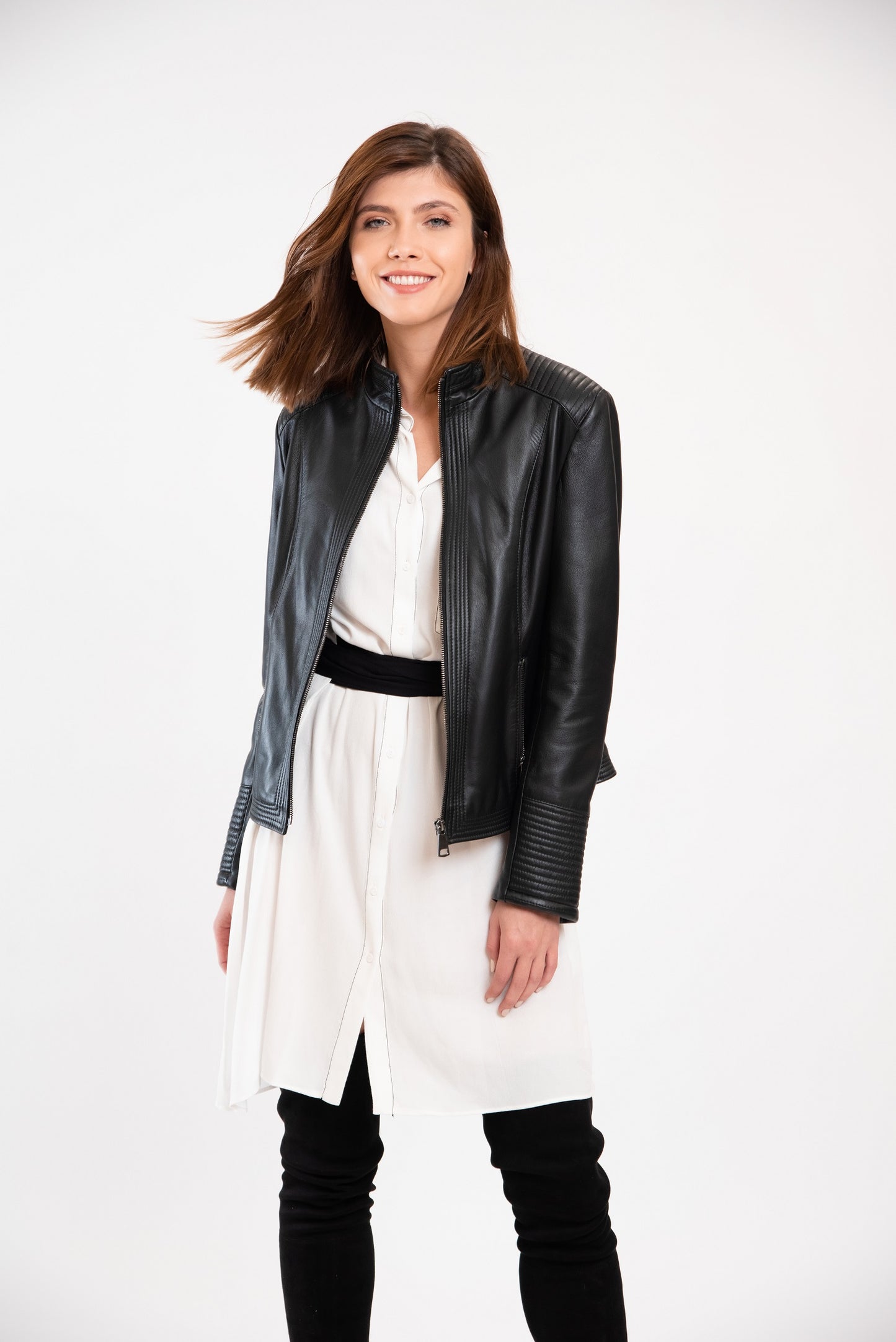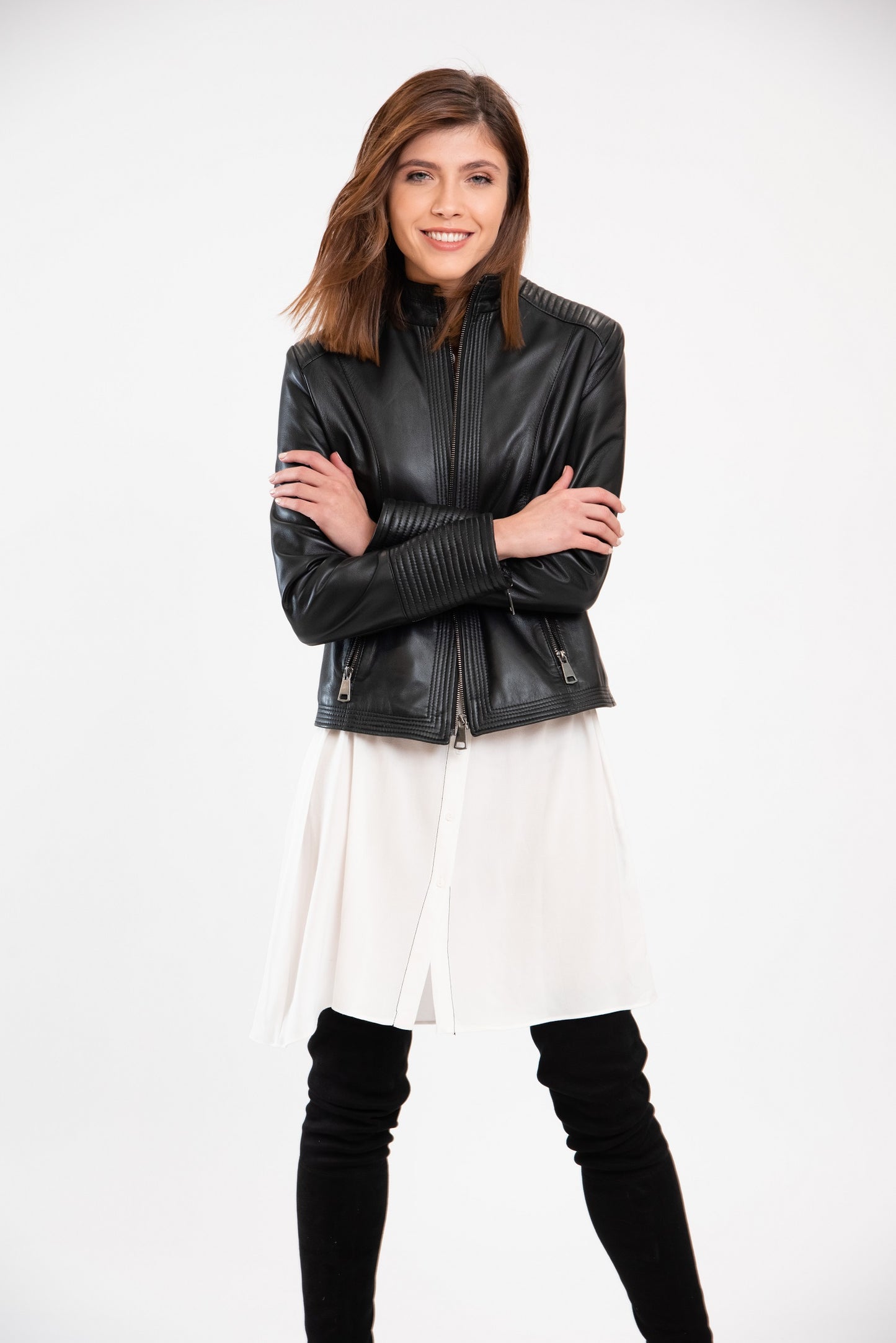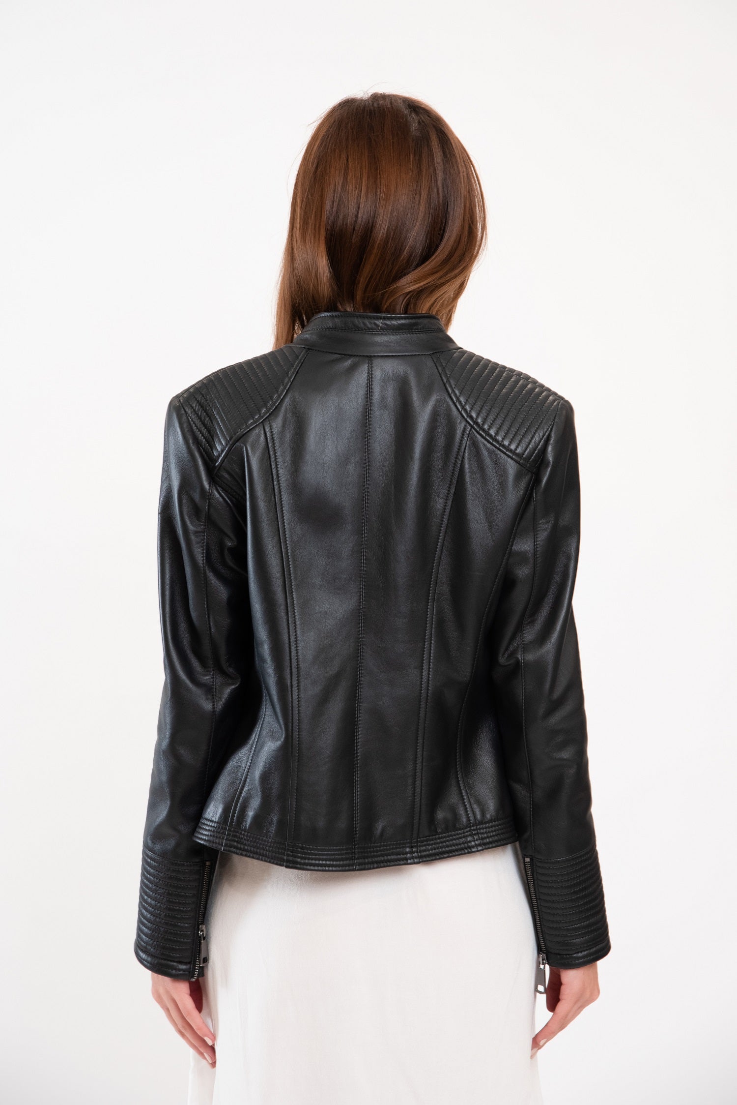 Handmade women's biker jacket crafted from premium black nappa lamb leather.
