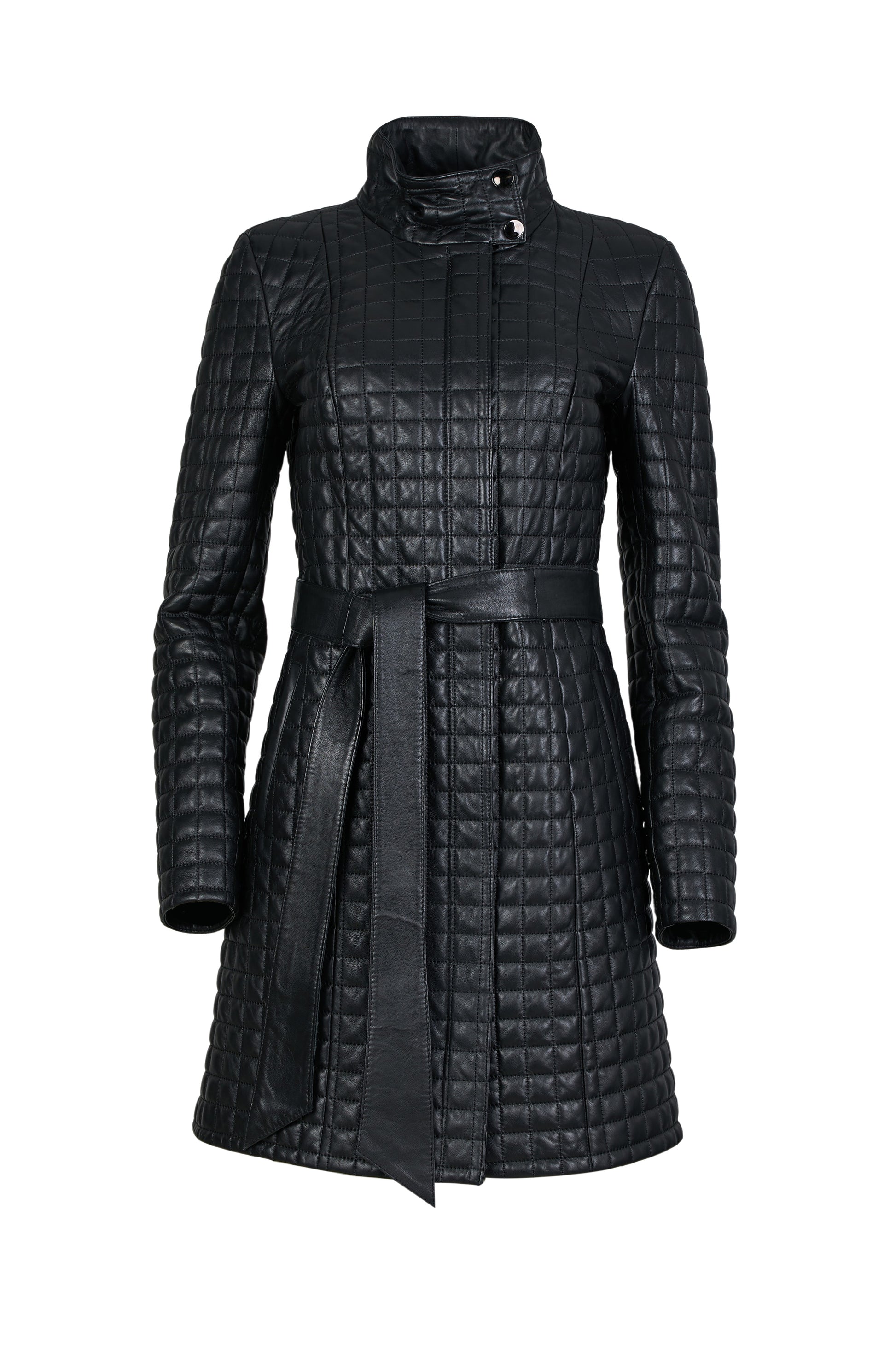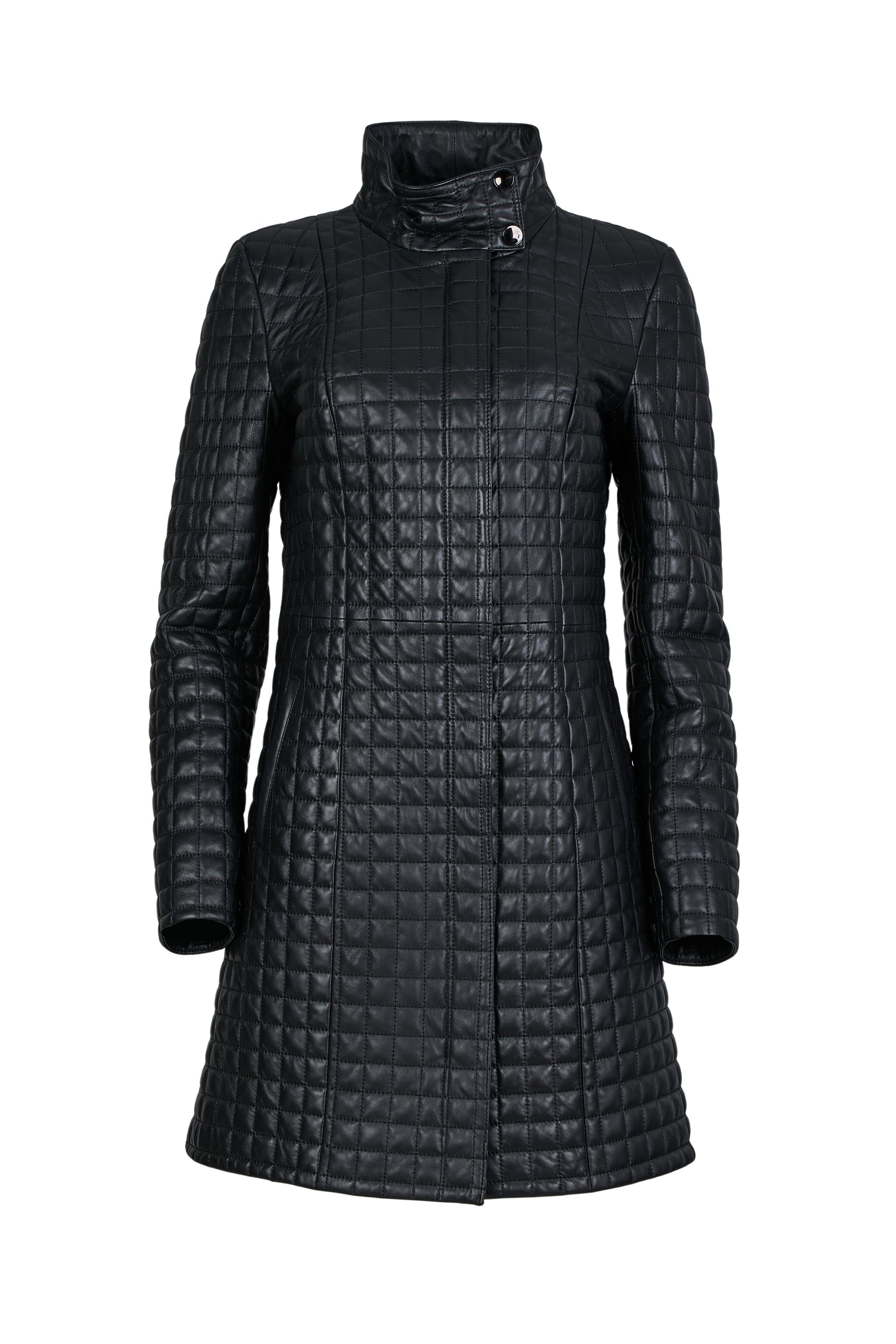Black Quilted Nappa Leather Coat with Abstract Pattern Lining