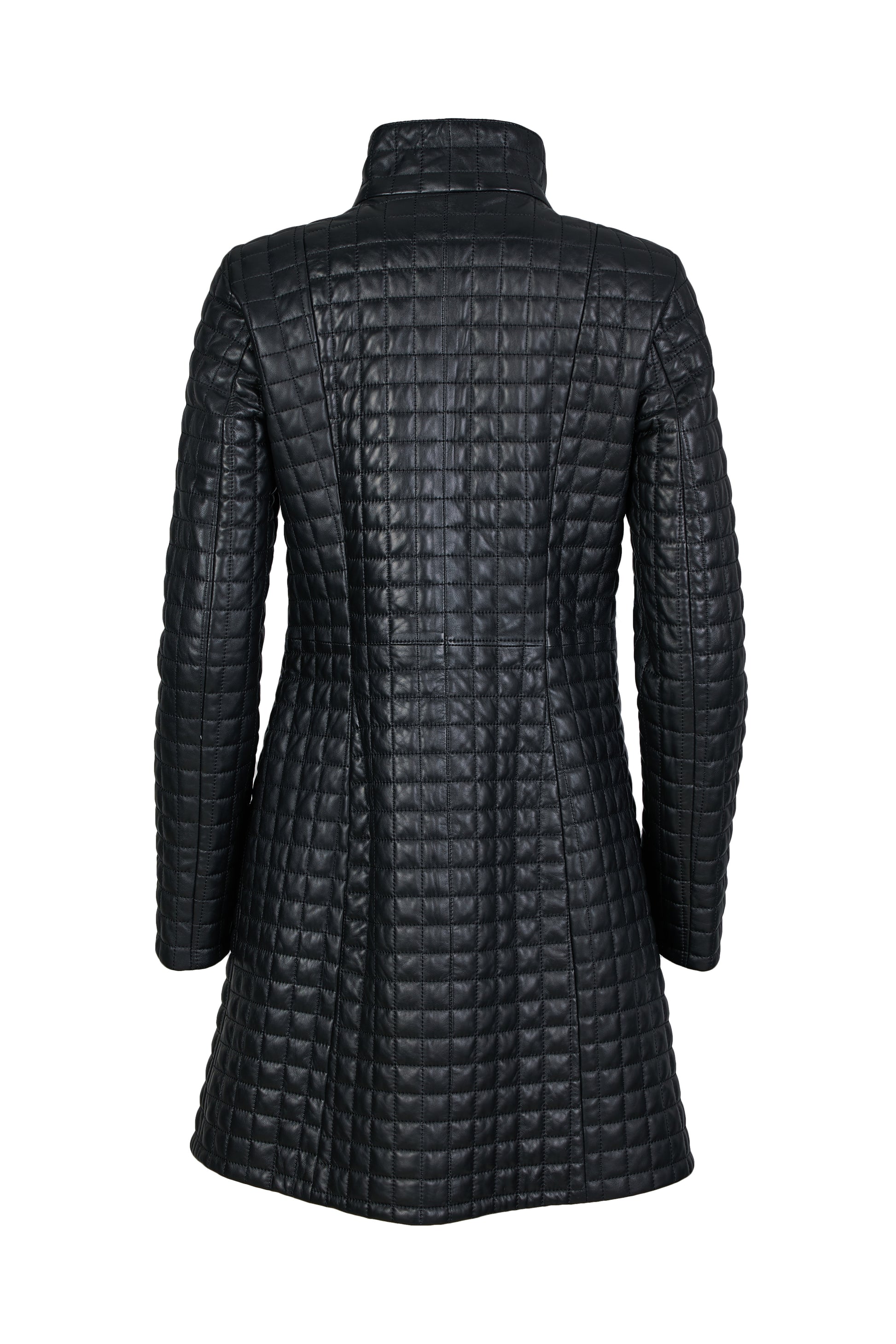 This exquisite women's coat is crafted from supple, high-quality nappa lamb leather featuring a distinct square-quilted design. Its tailored cut offers a flattering, modern silhouette. A standout feature is the vibrant viscose lining with an abstract, multicolored pattern, adding a luxurious and artistic touch when worn open.