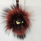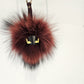 BURGUNDY Monster face Raccoon FUR Keychain. REAL fur eyes charm pompom keyring with genuine leather mask and strap.