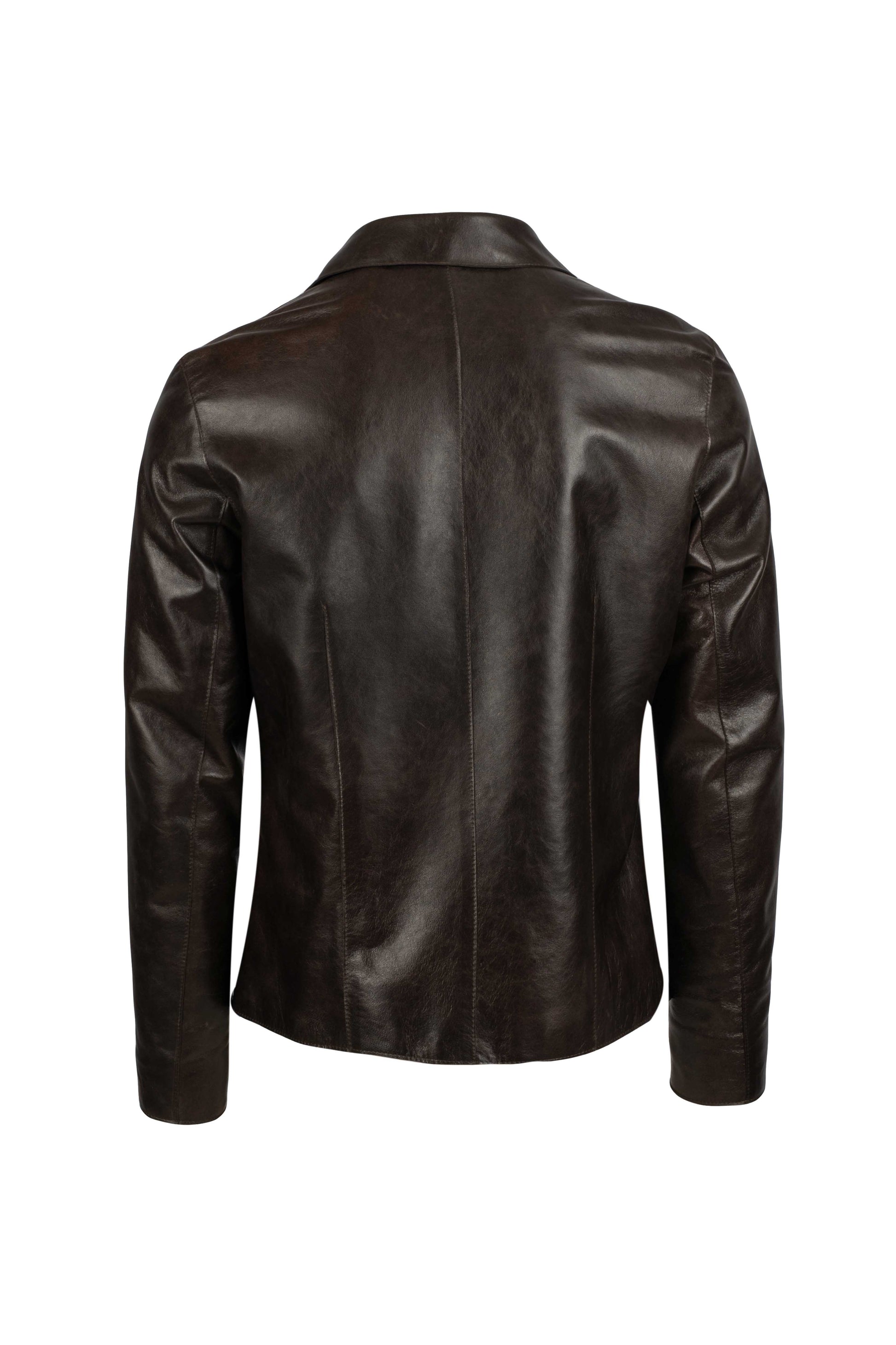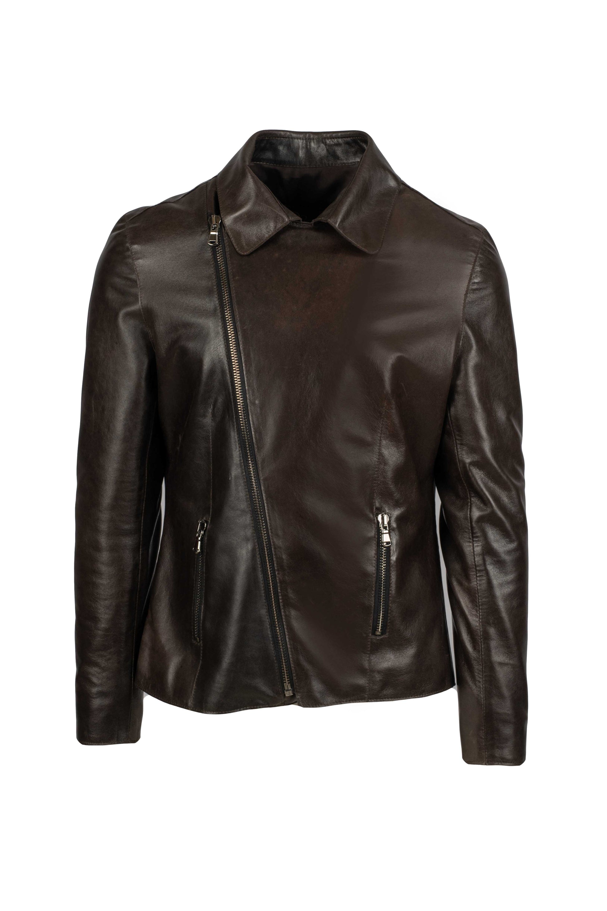 Handmade biker leather jacket crafted from dark brown waxed sheep leather.