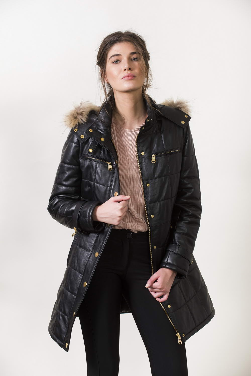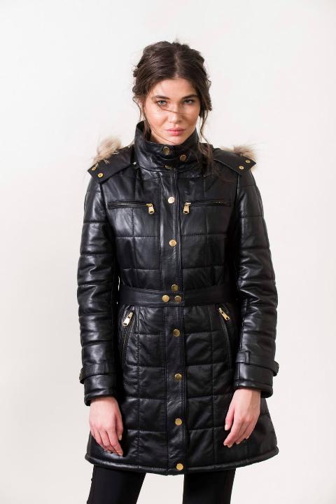 GIANNA- Women's Black Long Leather Jacket with hood.