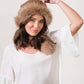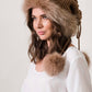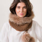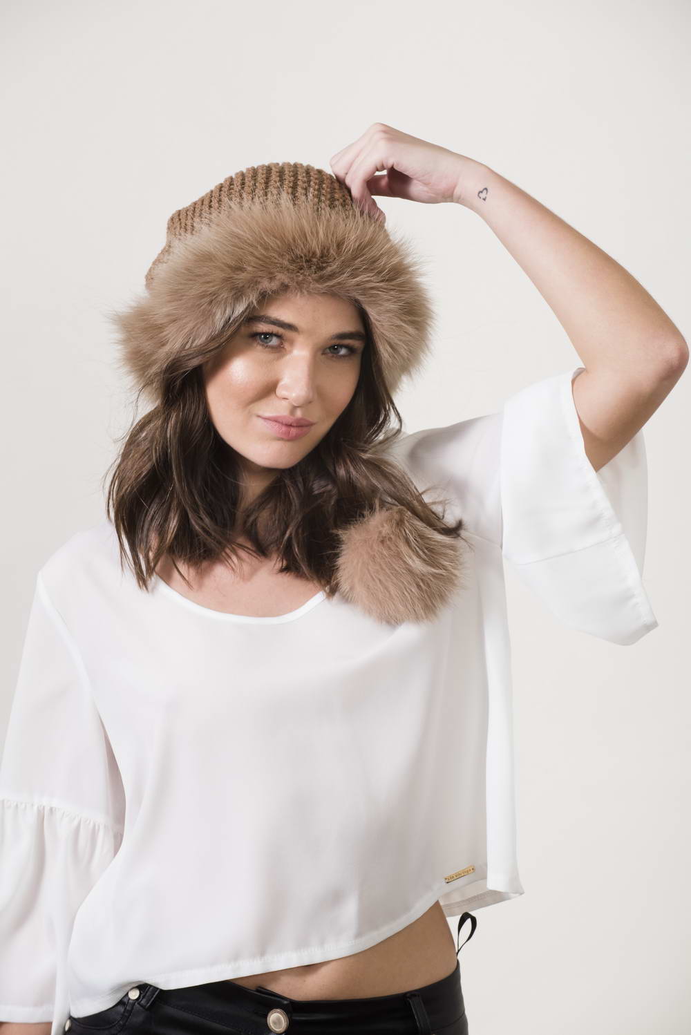 Handmade knitting collar and hat with fur and fluffy fox pompoms. Camel knitting fur neck collar.
