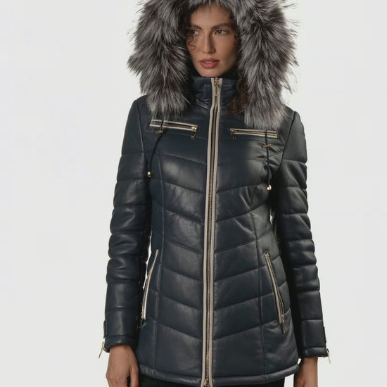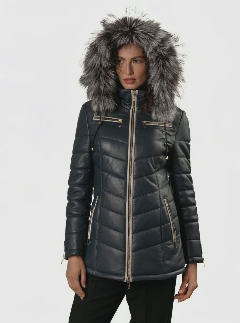 Women's Blue Leather Puffed Jacket with Removable Hood